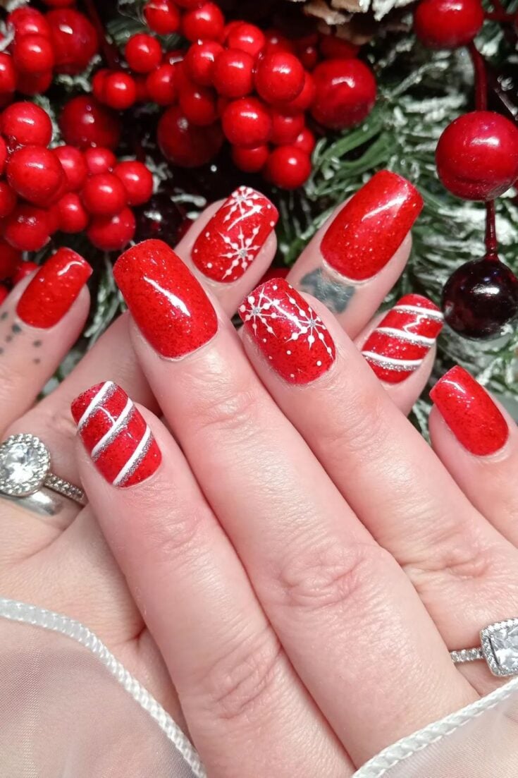 Bright red glitter nails with white snowflakes and candy-cane stripes. Cute, bold, and perfect for Christmas.