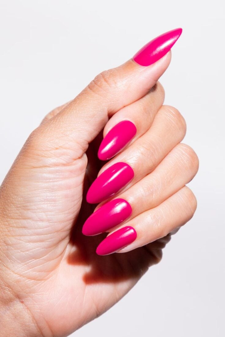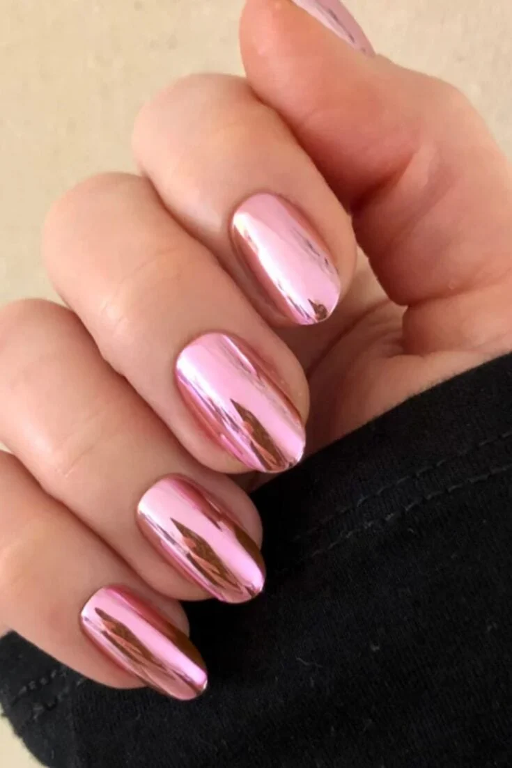 Medium oval nails with a high-shine chrome pink finish. Glossy, girly, and made to steal the spotlight.