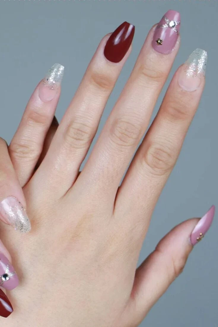 Burgundy press-ons with a luxe, glossy finish. Chic, simple, and perfect for date night or drinks out.