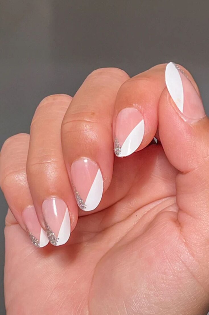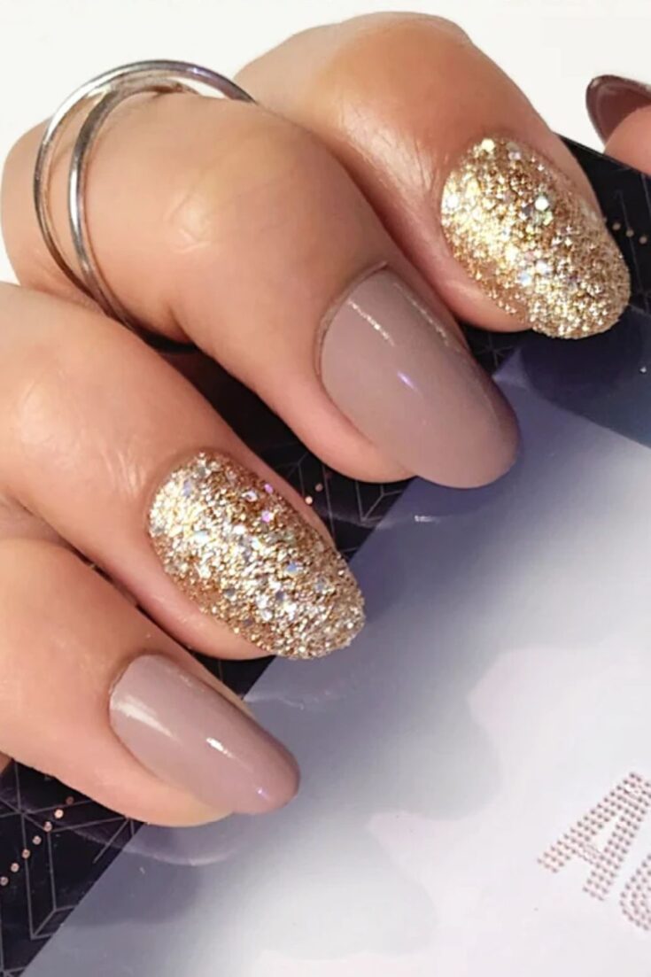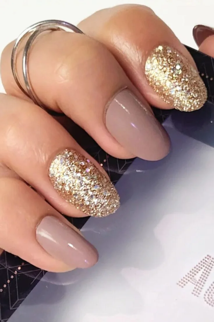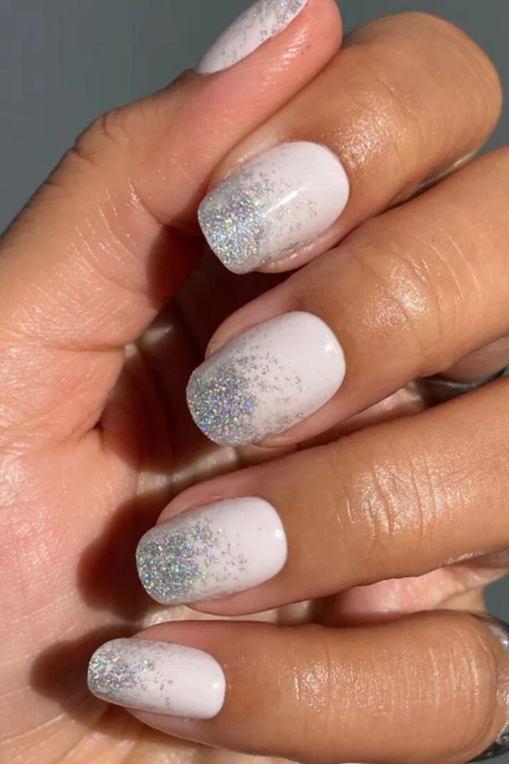Short squoval nails with a silver glitter gradient on a neutral base. Simple, sparkly, and perfect year-round.