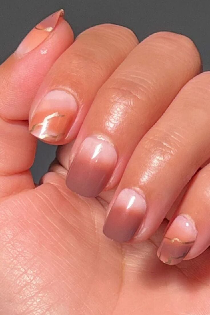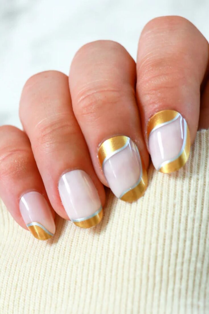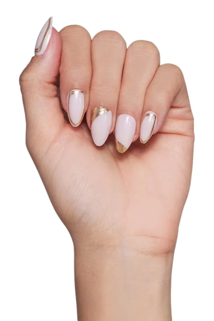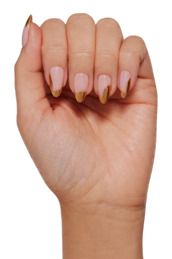Chic abstract gold foil tips on a sheer nude base. These short press-ons serve glam vibes—but reviews say they flake fast.