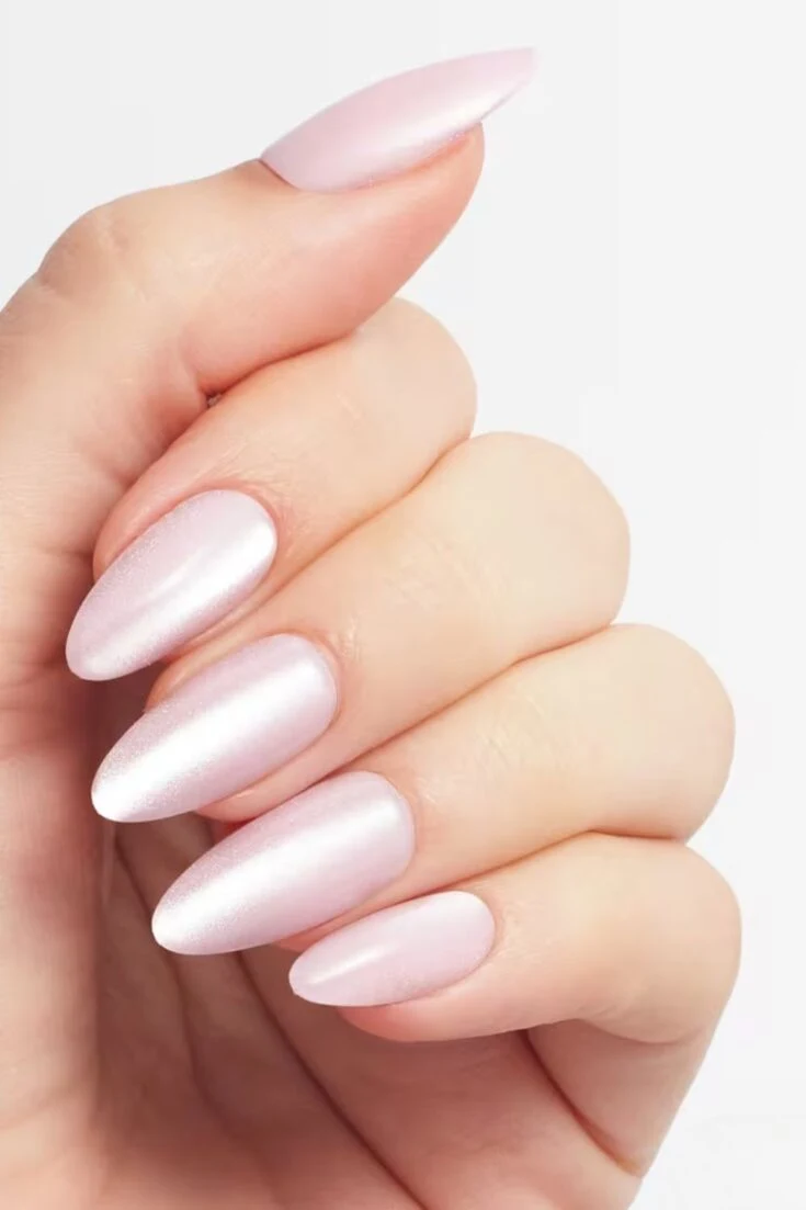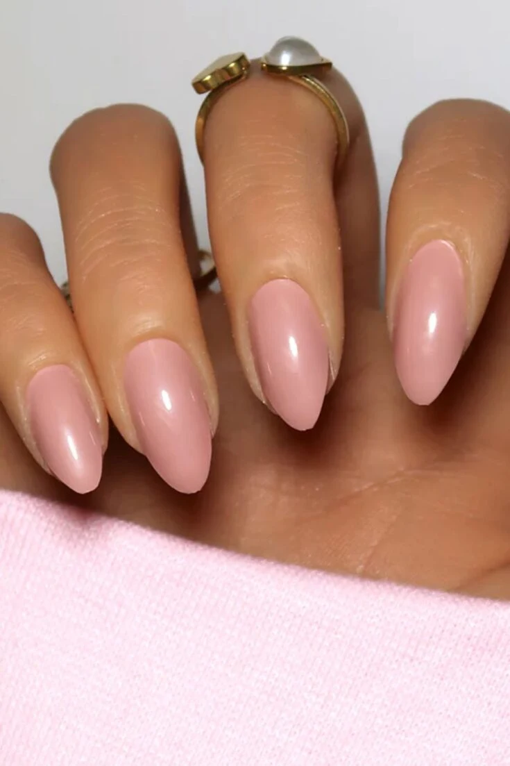 Short oval press-ons in a velvety beige-pink with a metallic sheen. Magical, trendy, and effortlessly elegant.
