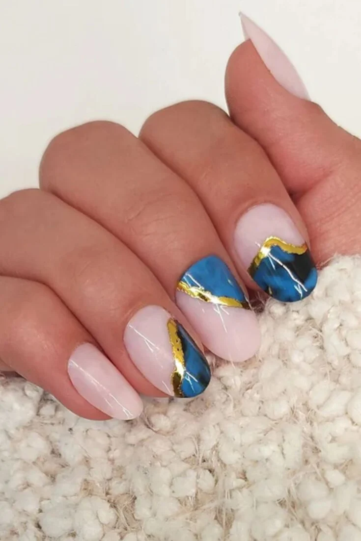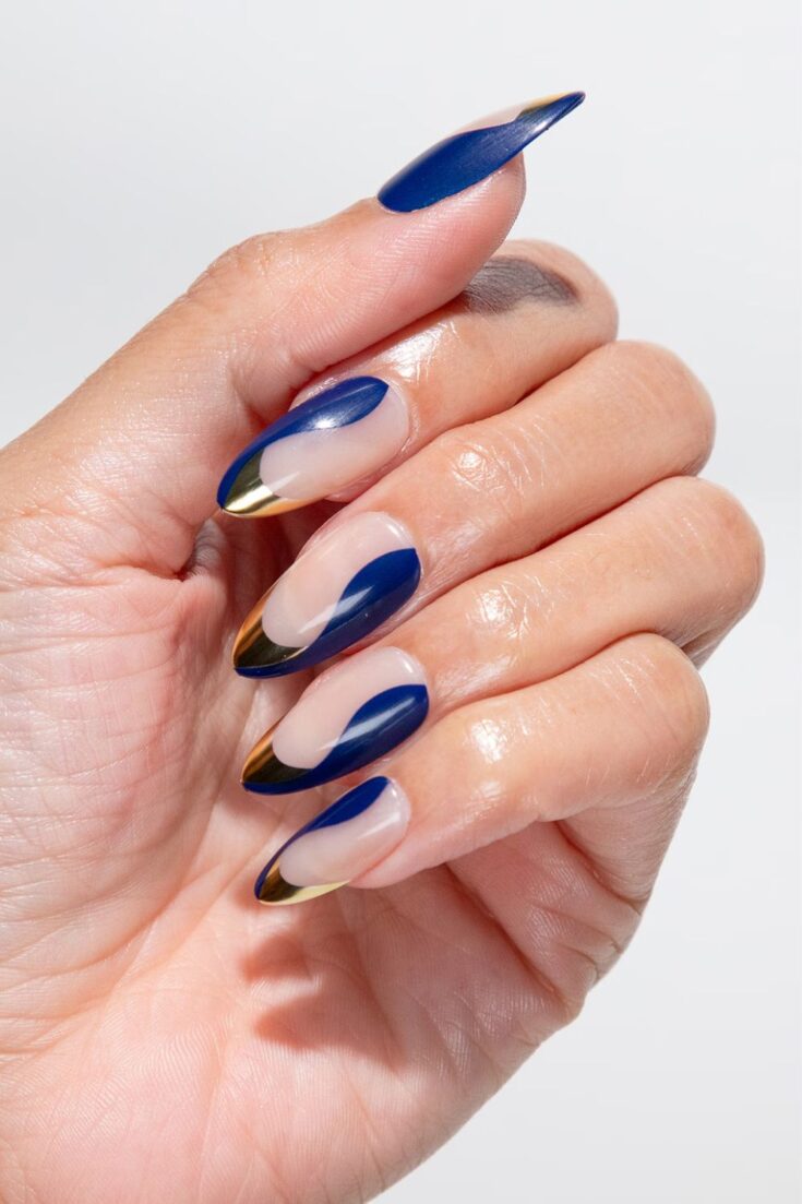 Navy and gold almond nails with a royal twist—cute, bold, and easy to apply.
