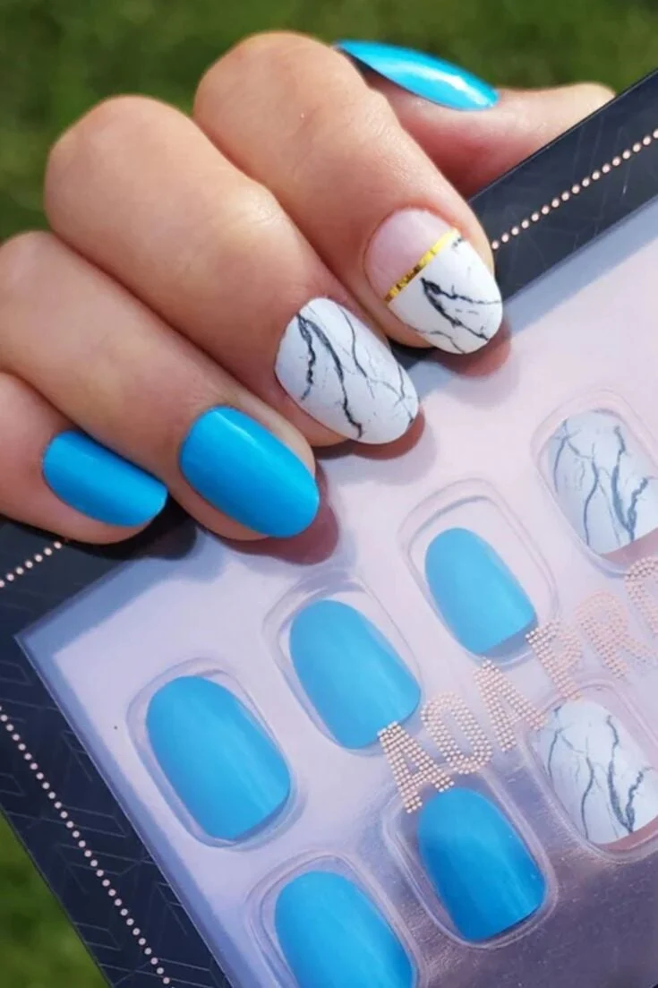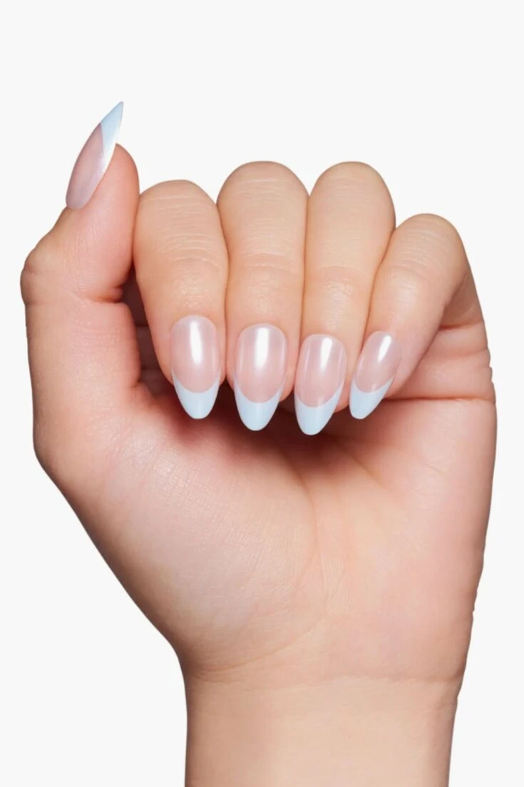 Short almond press-ons in a dreamy pastel blue. Soft, cute, and sweet like your favorite frosting.