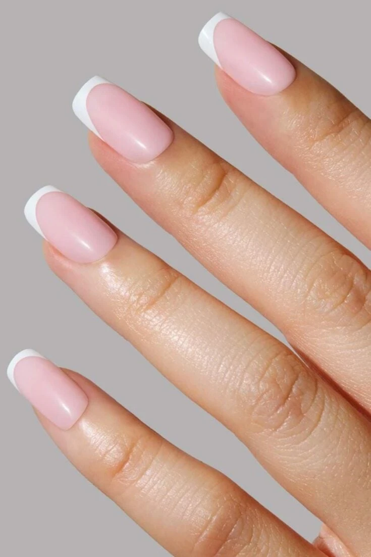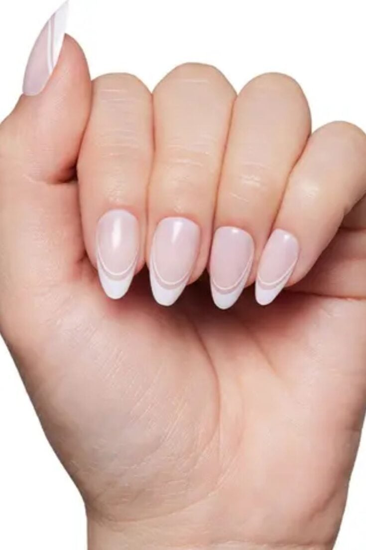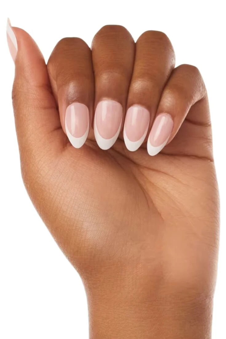 Short almond nails with a timeless white French tip. Natural-looking, elegant, and strong enough to last up to 2 weeks.
