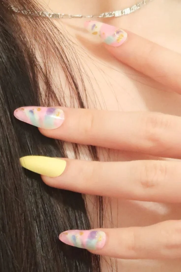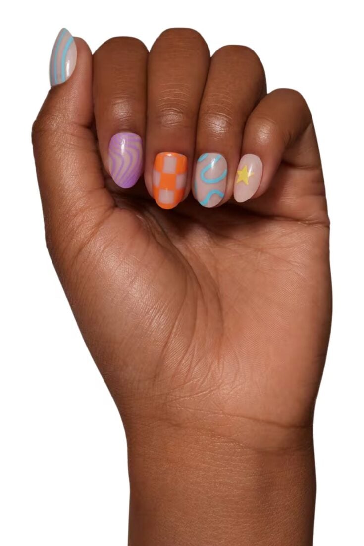 Colorful press-ons with artsy abstract accents on a soft yellow base. Playful, unique, and full of creative vibes.
