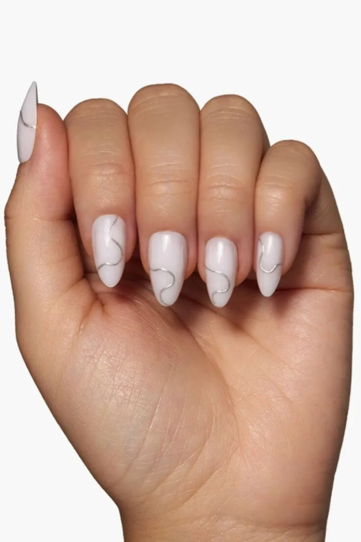 Short almond press-ons with silver swirls on a sheer white base. Elegant, festive, and perfect for winter magic.