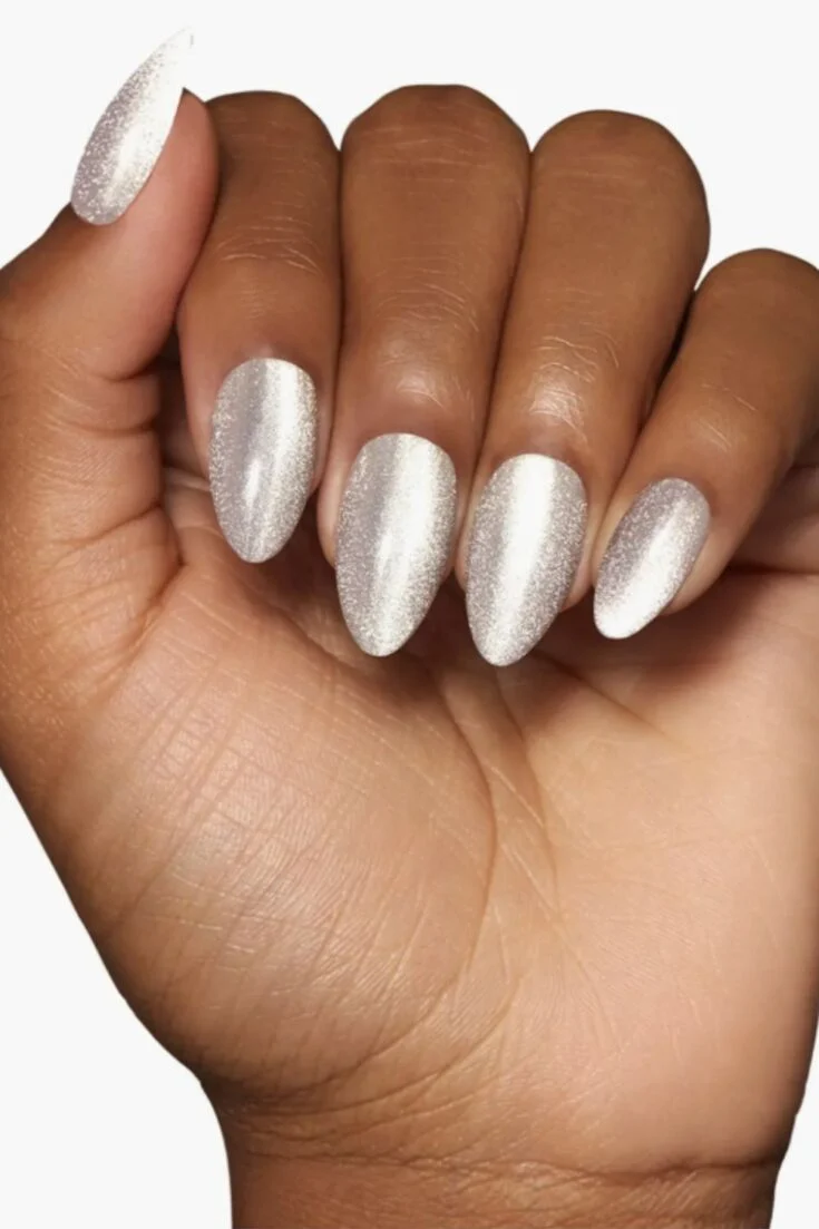 Short almond press-ons with a shimmering silver cat-eye finish. Elegant, cool-toned, and made to catch the light.