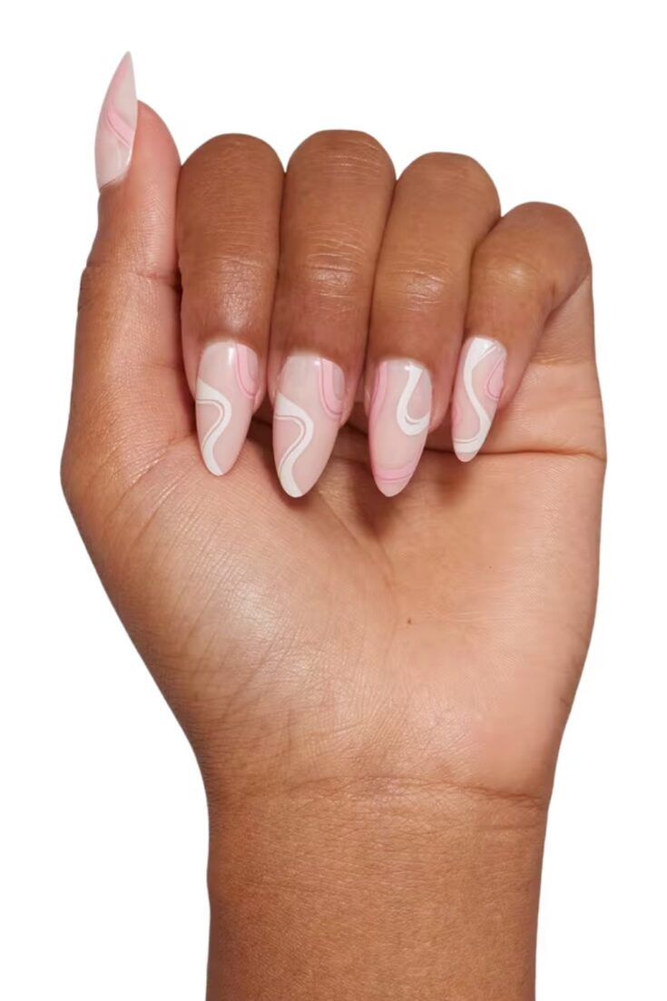 A dreamy pink and white swirl on a medium almond shape. Soft, cute, and ready to level up any outfit.