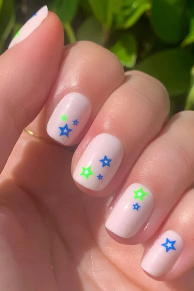 Extra short squoval nails in a neutral base with tiny celestial star accents. Cute, simple, and out of this world.
