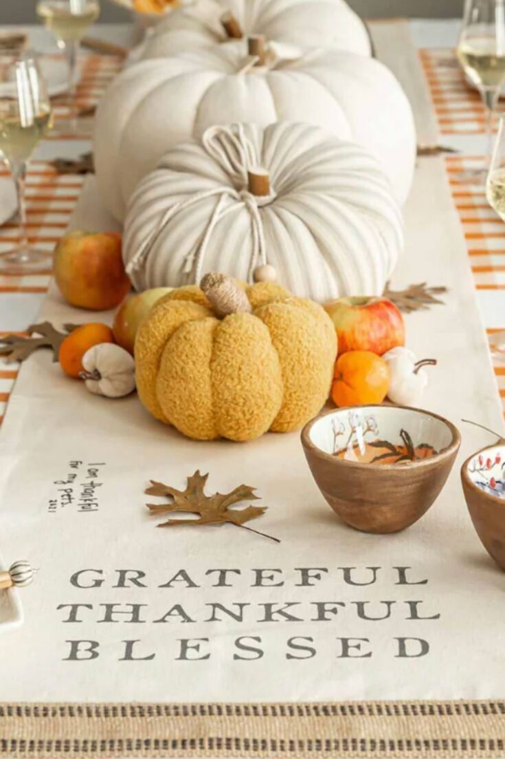 Create a meaningful Thanksgiving tradition with the Thankful Table Runner. This cotton runner features “Grateful. Thankful. Blessed” and space for guests to write what they’re thankful for. Perfect for holiday gatherings and reuse year after year.