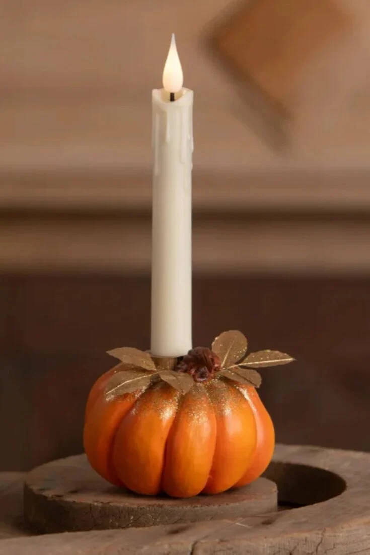Add autumn charm to your Thanksgiving table with this Bethany Lowe Pumpkin Candlestick. Hand-painted gold leaves, glitter accents, and a golden candle cup make it the perfect centerpiece for fall decor and Thanksgiving tablescapes.